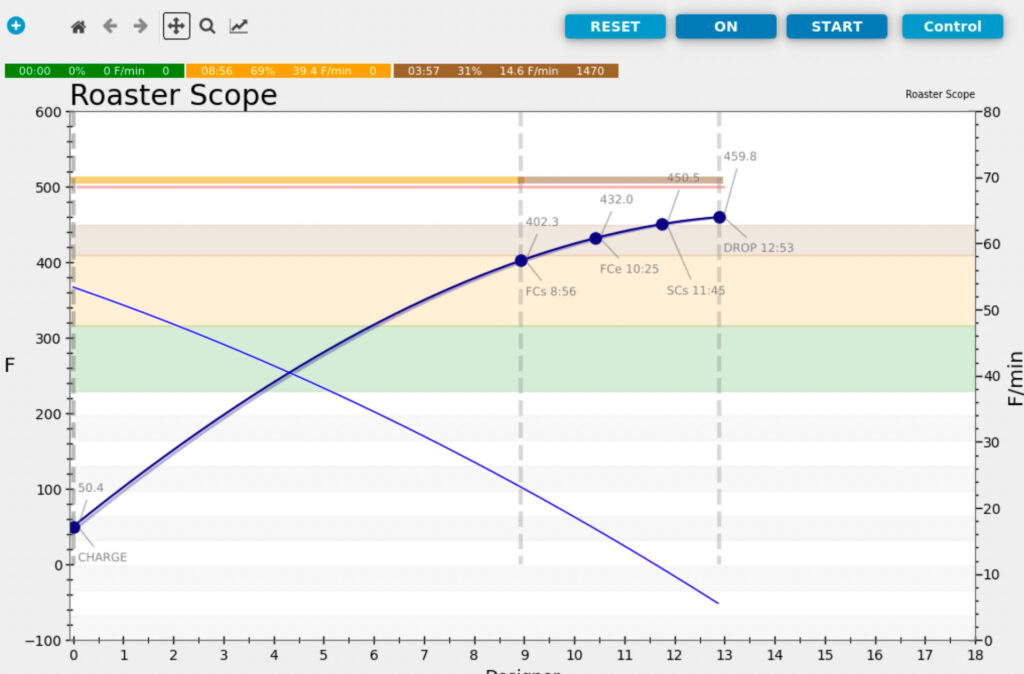 Looking for a great starter background roast profile for Artisan-Scope for use with automation? This is a good general profile, I call it 9 Minutes to First Crack. In the image below you can see what it looks like in Artisan-Scope Designer with each point and a clean ROR. For a little Designer practice, try creating the curve yourself with the points listed in the photo. Download below!